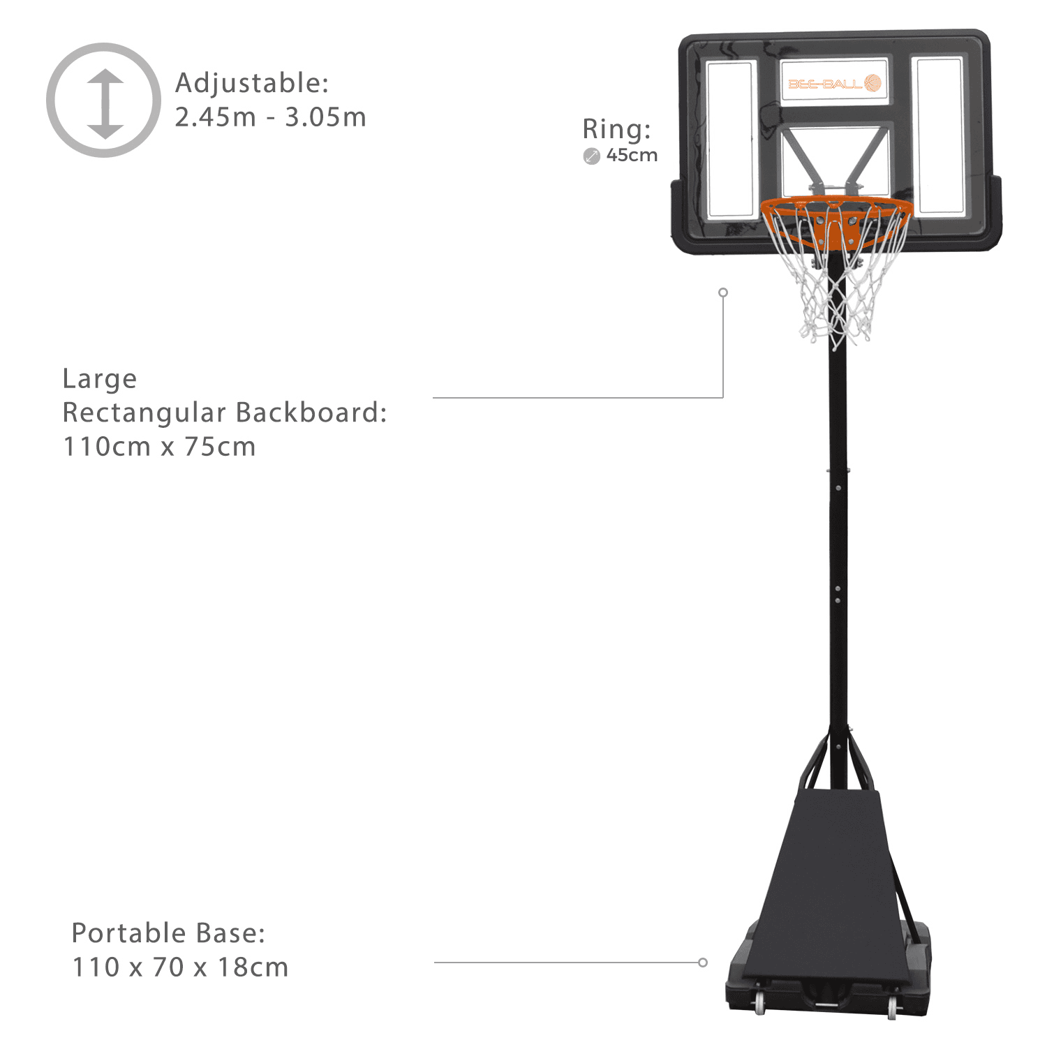 Experience the ultimate in basketball with this premium basketball hoop designed to provide you with the best possible playing experience. Boasting a generously sized 110cm by 75cm backboard, this hoop provides a large target area to help you perfect your shooting skills.